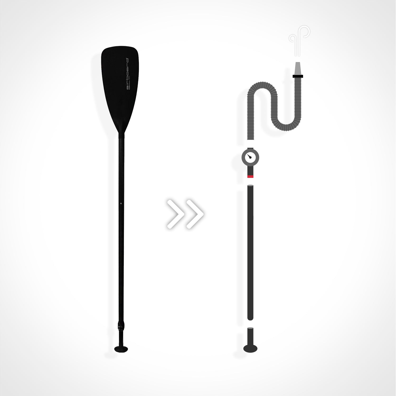 Die Paddle-Innovation vom Schweizer SUP-Pionier. Äusserlich unterscheidet sich das patentierte Paddle-System kaum von einem normalen SUP-Paddle. Die entscheidenden Änderungen wurden im Inneren des 3-teiligen Paddels vorgenommen. Die Luft wird durch einfache Pump-Bewegungen über den ausziehbaren Teil des Paddels erzeugt. Das Dichtungssystem erlaubt dabei einen ausreichend grossen Druck für aufblasbare Stand Up Paddleboards. Durch das geringere Volumen des Schaftes lässt sich der Druck mit massiv weniger Kraftaufwand erzeugen. Das PumpPaddle ist unterwegs zum Nachpumpen als Notpumpe gedacht, zudem kann es zur zusätzlichen Druckkontrolle verwendet werden. Es wird dazu der Pumpschlauch von der Pumpe benötigt, welcher am Manometer-Adapter und am SUP Ventil befestigt wird.